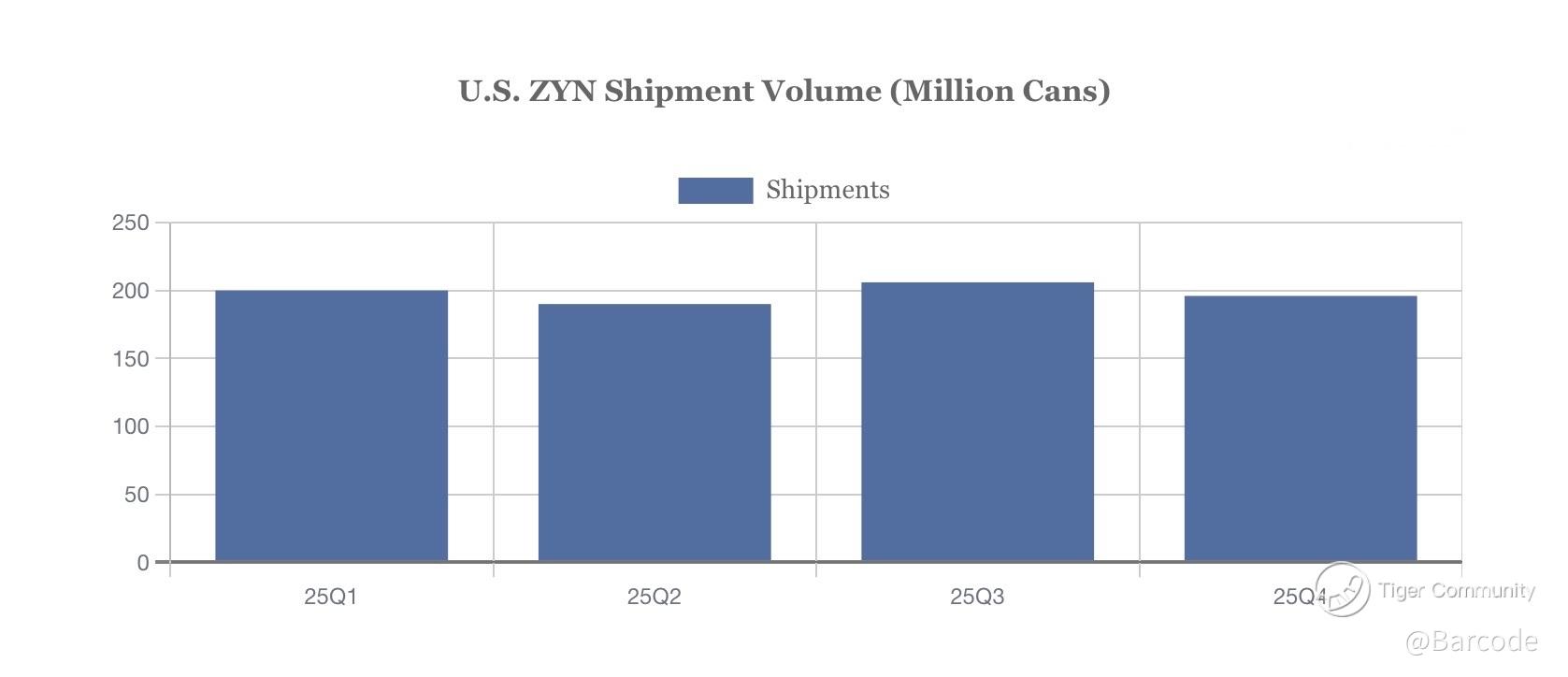 Q4 shipments fell to 196M cans from Q3โs 206M due to destocking. Approximately 25M surplus ZYN cans remain in distribution channels, expected to normalize during Q1 2026, creating short-term forecasting noise.