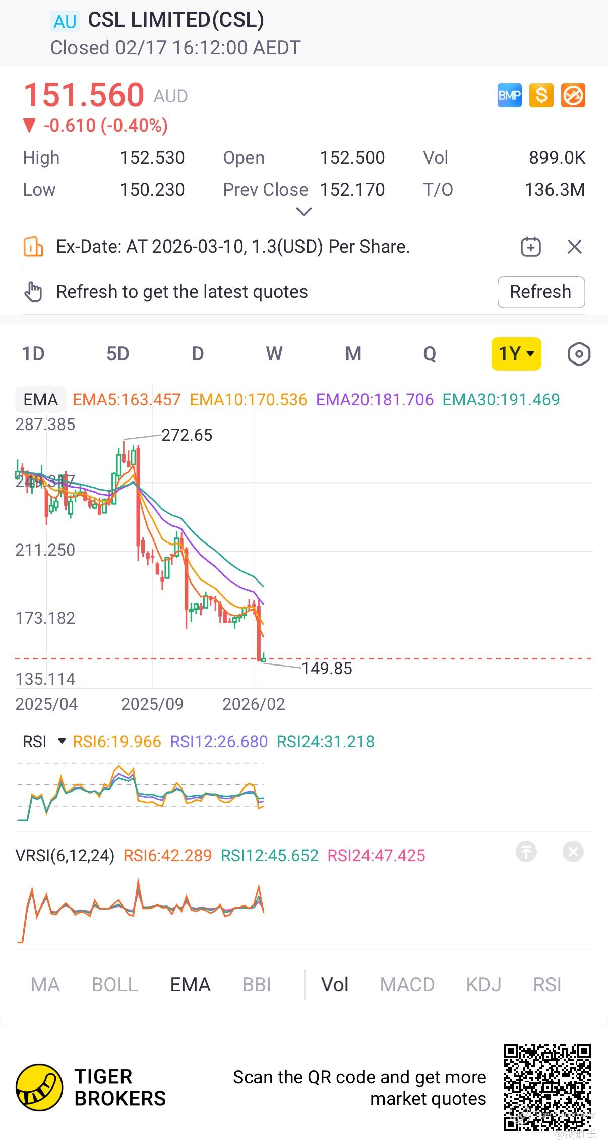 $CSL LIMITED(CSL.AU)$ near 52-week low