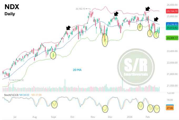 $NASDAQ 100(NDX)$ : A breach of the lower Bollinger Band has propelled a visit to the 20DMA at the very least in previous cases.