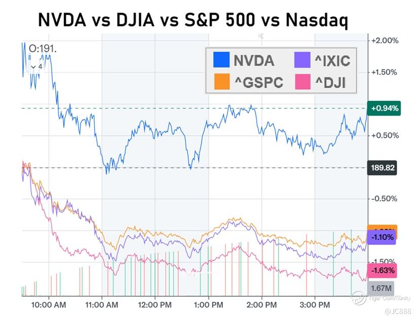 What was pleasantly surprise on Monday was while all 3 major US indexes fell, $NVIDIA(NVDA)$ went against the trend and rose marginally by +0.91%, ending the day at $191.55 /share. (see below)