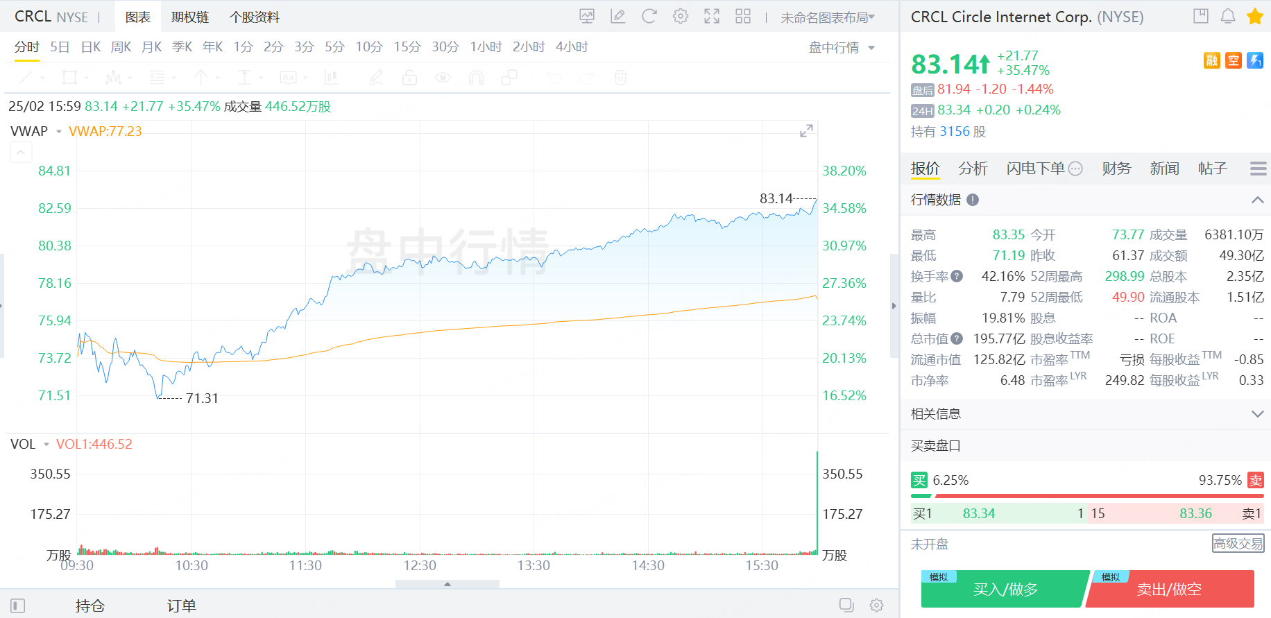 股價表現:財報公佈後,Circle 股價在 2 月 26 日大漲約 35%,創下該公司有史以來最大的單日漲幅。