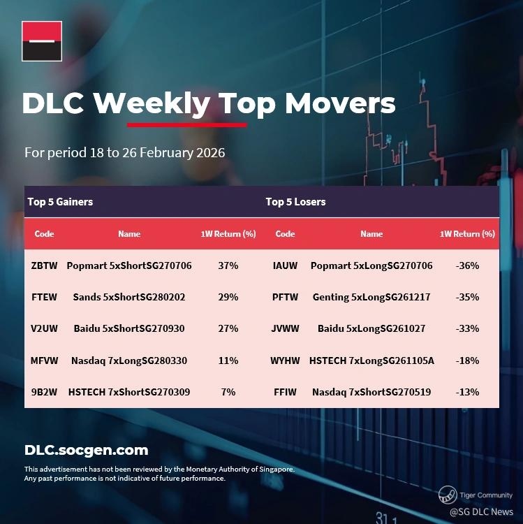 Topping the table this week is $Popmart 5xShortSG270706(ZBTW.SI)$ , which gained 37% over the period 18-25 February 2026. This came as $POP MART(09992)$ fell close to 6% over the same period in a volatile trading week for markets amidst tariff and geopolitical uncertainty.