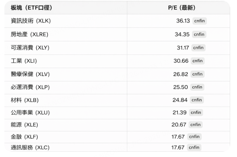 板塊方面,我們要小心美股負債率較高的,市盈率較高但增長較低的板塊,可以在一些被低估的板塊中尋找一些價值股來跟進,比如我用AI列出了目前各大板塊的市盈率數據,數據截止2026年的2月23日。[Yummy]