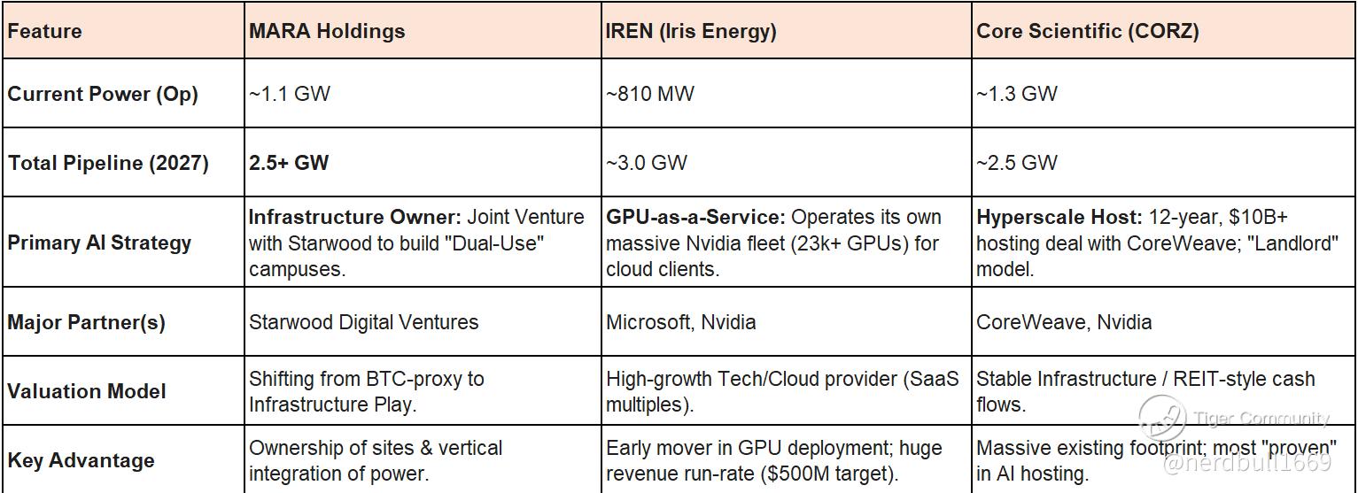 The following table compares MARA with the two other primary "pivoting" miners as of early 2026.