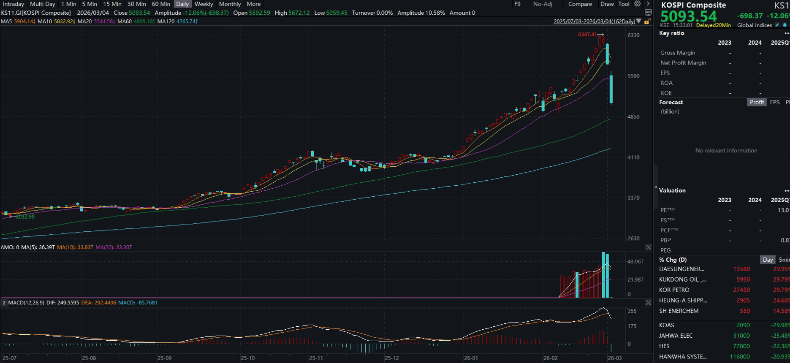 Samsung Electronics and SK Hynix carry extremely heavy weightings in the KOSPI. Among tech heavyweights today, Samsung Electronics fell 7.10% while SK Hynix declined 4.91%. Together, the two companies account for nearly 40% of the index’s weighting. Both stocks have now dropped more than 20% over the past two sessions, directly dragging the broader market lower.