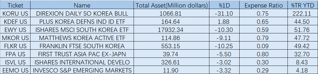 From the perspective of ETF performance, nearly all Korea-related products suffered significant declines. $iShares MSCI South Korea ETF(EWY)$ dropped 10.30% in a single day, while $Franklin FTSE South Korea ETF(FLKR)$ fell 10.25%, with both broad-based Korea ETFs posting similar losses. The leveraged product $Direxion Daily MSCI South Korea Bull 3x Shares(KORU)$ saw the most dramatic decline, plunging 31.10% in a single day, amplifying index volatility. The actively managed product $Matthews Korea Active ETF(MKOR)$ also fell 9.11%. The defense sector ETF $PLUS Korea Defense Industry Index ETF(KDEF)$ , which had gained 5% over two consecutive days, plunged 10.98% in overnight trading on Monday.