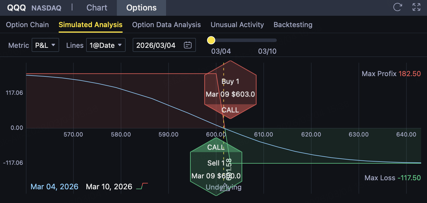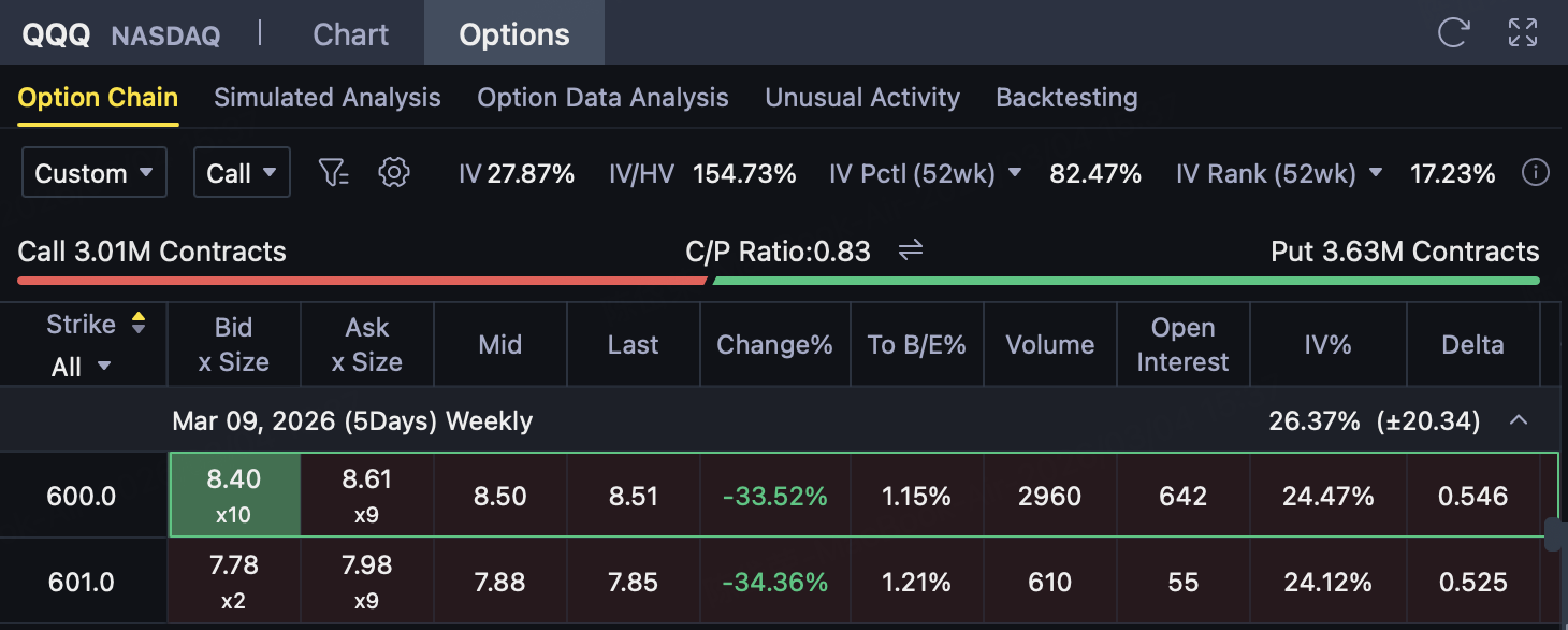 The winning rate of the strategy depends on"Price holds below 600 or at least does not effectively break through 601.92"The judgment of; If QQQ rapidly rises and breaks through the pressure range, losses will expand, butThe maximum loss has been capped when opening the position