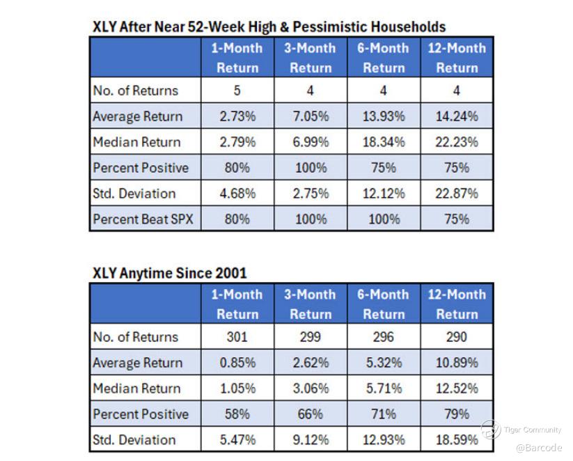 Historically, when discretionary equities approach highs during periods of household pessimism, forward returns have skewed positive: