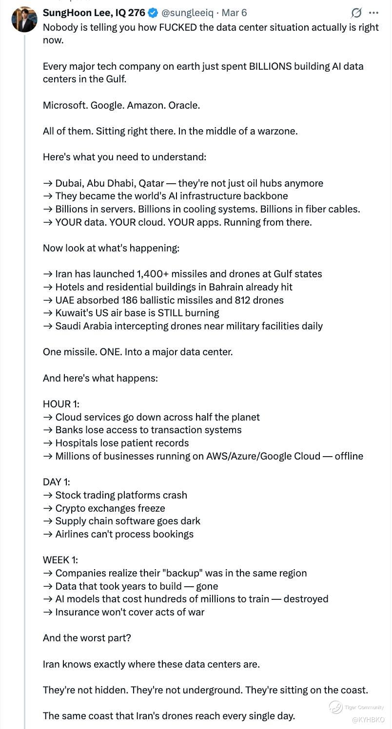 An Iranian drone just hit an Amazon data centre in the UAE. AWS had to emergency shut down power to prevent the fire from spreading. Cloud outages across the region. Iran is now hitting the internet itself. - Clash Report
