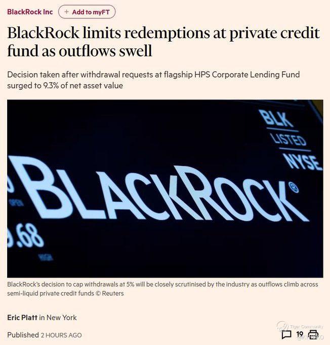 Two of the world's largest funds are limiting the amount you can withdraw. BlackRock froze requests for withdrawals of $1.2 billion from its private credit fund. Investors in the BlackRock fund with assets of $26 billion requested the withdrawal of 9.3% of their funds. BlackRock refused, limiting the withdrawal to 5%. The Blackstone fund with assets of $82 billion recorded a record number of requests for withdrawals in the same week. Blackstone had to invest $400 million of its own funds to cover the costs of withdrawals. Similar problems exist with the Blue Owl OBDC II fund, where withdrawals have been suspended. - X user Cha Bowes
