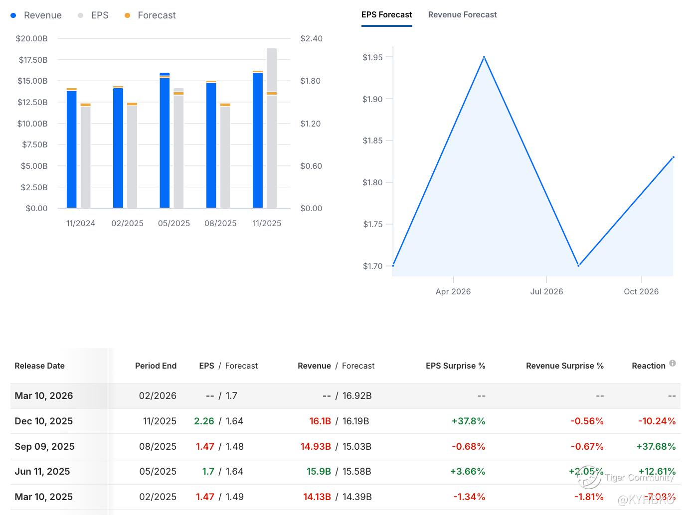 The EPS and revenue forecasts are $1.70 and $16.92B, respectively.