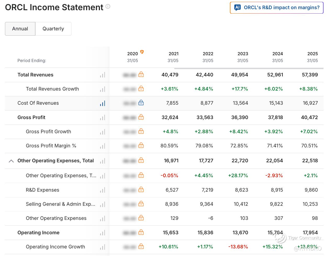 Oracle has demonstrated steady growth over the last five years. Revenue increased from $40.4 billion in 2021 to $57.3 billion in 2025. Gross profit rose from $32.6 billion in 2021 to $40.4 billion in 2025, while operating income grew from $15.6 billion in 2021 to $17.9 billion in 2025.