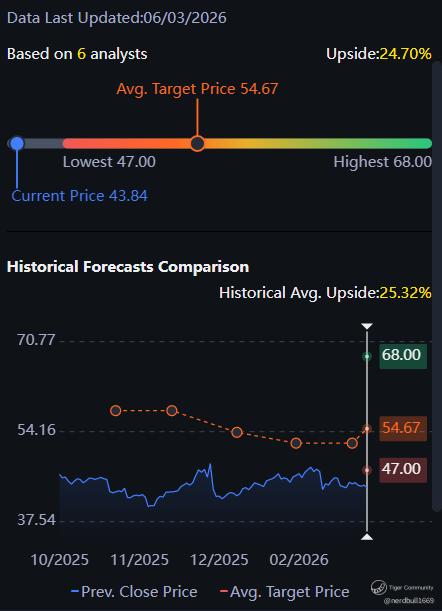 • Resistance: $47.00 (Recent analyst price targets and technical ceiling)