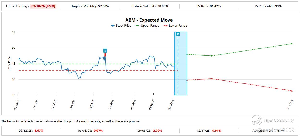 Volatility Outlook: Historically, ABM's post-earnings move is relatively modest (average of ~1.7%). However, because the current forward P/E is near a 1-year low (~11.8x), a positive surprise in the Technical Solutions guidance could trigger a more outsized "value-rebound" move.