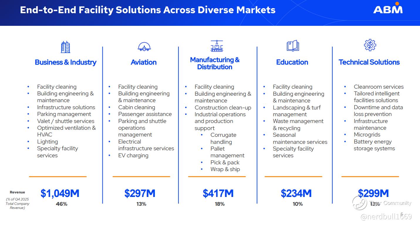 • Lesson: Growth in 2026 isn't coming from office cleaning; it’s coming from the "Technical Solutions" and "Manufacturing & Distribution" pillars. Any investment thesis for ABM must rely on their ability to cross-sell technical services (like EV charging or microgrids) to their existing base.