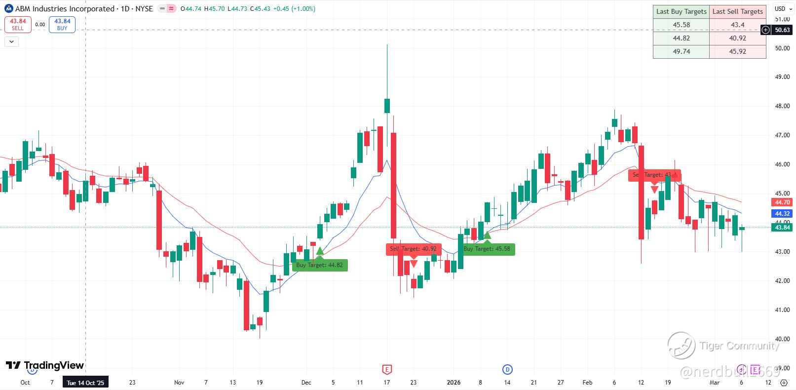 The "Recovery" Play: The stock has seen a recent pullback (~5.5% in the last month) and is trading near its 1-year lows ($40.00–$44.00). If ABM beats on EPS and confirms that the self-insurance adjustments that plagued Q4 are behind them, a relief rally toward the 200-day moving average (near $46.24) is a plausible short-term target.