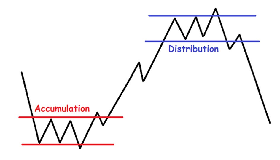 Distribution happens after a strong move up when smart money begin selling to late buyers.