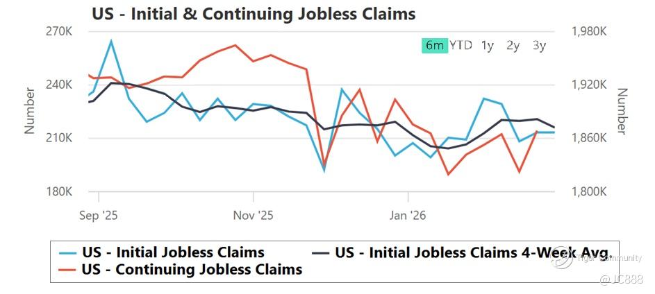 For week ending 28 Feb 2026, US weekly jobless claims came in ‘flat’ at 213,000 vs market consensus of 215,000 vs previous week claims of 213,000. (see below)
