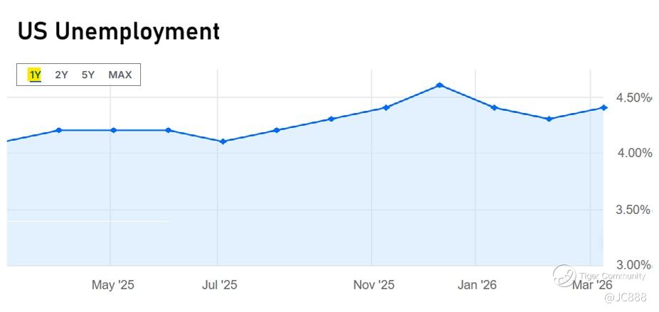 For February 2026, US unemployment rate, rose by +0.1% to 4.4% vs analysts’ consensus of 4.3% vs January 2026’s 4.3%, catching many analysts by surprise.