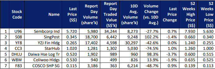 $Sembcorp Ind(U96.SI)$ $SingPost(S08.SI)$ $YZJ Fin Hldg(YF8.SI)$ $StarHub(CC3.SI)$ $Daiwa Hse Log Tr(DHLU.SI)$ $Coliwoo Hldgs(W8W.SI)$ $COSCO SHP SG(F83.SI)$