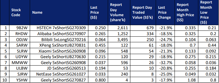 $HSTECH 7xShortSG270309(9B2W.SI)$ $Alibaba 5xShortSG270907(RHDW.SI)$ $Bilibili 5xLongSG270216(ODJW.SI)$ $XPeng 5xShortUB270831(SARW.SI)$ $Xiaomi 5xShortSG260908(SLRW.SI)$ $Geely 5xShortUB270630(UDYW.SI)$ $Geely 5xShortSG260908(MMWW.SI)$ $JD 5xShortSG260513(ULBW.SI)$ $NetEase 5xShortSG261027(SJRW.SI)$ $Geely 5xShortSG270827(YSHW.SI)$