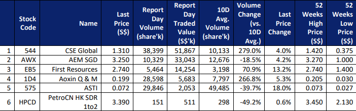 $CSE Global(544.SI)$ $AEM SGD(AWX.SI)$ $First Resources(EB5.SI)$ $Aoxin Q & M(1D4.SI)$ $ASTI(575.SI)$ $PetroCN HK SDR 1to2(HPCD.SI)$