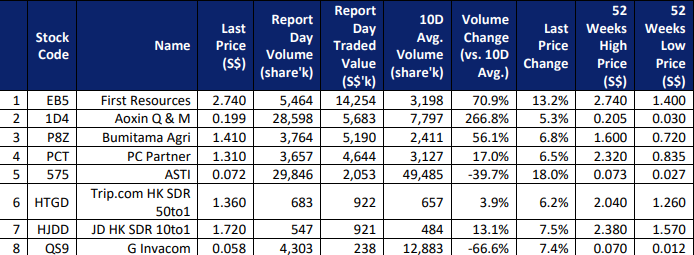 $First Resources(EB5.SI)$ $Aoxin Q & M(1D4.SI)$ $Bumitama Agri(P8Z.SI)$ $PC Partner(PCT.SI)$ $ASTI(575.SI)$ $Trip.com HK SDR 50to1(HTGD.SI)$ $JD HK SDR 10to1(HJDD.SI)$ $G Invacom(QS9.SI)$