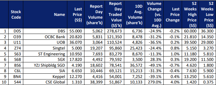 $DBS(D05.SI)$ $OCBC Bank(O39.SI)$ $UOB(U11.SI)$ $Singtel(Z74.SI)$ $ST Engineering(S63.SI)$ $SGX(S68.SI)$ $YZJ Shipbldg SGD(BS6.SI)$ $SIA(C6L.SI)$ $Keppel(BN4.SI)$ $CSE Global(544.SI)$