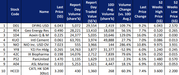 $DFIRG USD(D01.SI)$ $Geo Energy Res(RE4.SI)$ $Aoxin Q & M(1D4.SI)$ $Intl Cement(KUO.SI)$ $NIO Inc. USD OV(NIO.SI)$ $YZJ Fin Hldg(YF8.SI)$ $IX Biopharma(42C.SI)$ $PanUnited(P52.SI)$ $ASL Marine(A04.SI)$ $CATL HK SDR 30to1(HCCD.SI)$