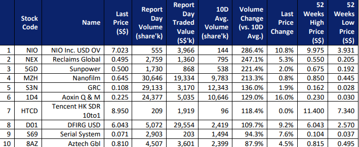 $NIO Inc. USD OV(NIO.SI)$ $Reclaims Global(NEX.SI)$ $Sunpower(5GD.SI)$ $Nanofilm(MZH.SI)$ $GRC(S3N.SI)$ $Aoxin Q & M(1D4.SI)$ $Tencent HK SDR 10to1(HTCD.SI)$ $DFIRG USD(D01.SI)$ $Serial System(S69.SI)$ $Aztech Gbl(8AZ.SI)$