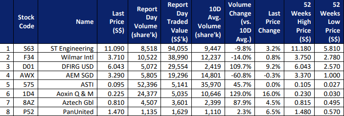 $ST Engineering(S63.SI)$ $Wilmar Intl(F34.SI)$ $DFIRG USD(D01.SI)$ $AEM SGD(AWX.SI)$ $ASTI(575.SI)$ $Aoxin Q & M(1D4.SI)$ $Aztech Gbl(8AZ.SI)$ $PanUnited(P52.SI)$