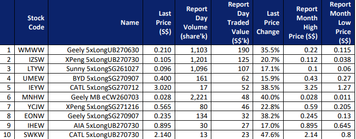 $Geely 5xLongUB270630(WMWW.SI)$ $XPeng 5xLongUB270730(IZSW.SI)$ $Sunny 5xLongSG261027(LTYW.SI)$ $BYD 5xLongSG270907(UMEW.SI)$ $CATL 5xLongSG270712(IEYW.SI)$ $Geely MB eCW260703(MNHW.SI)$ $XPeng 5xLongSG271216(YCJW.SI)$ $Geely 5xLongSG270907(EONW.SI)$ $AIA 5xLongUB270730(IHEW.SI)$ $CATL 5xLongUB270730(SWKW.SI)$