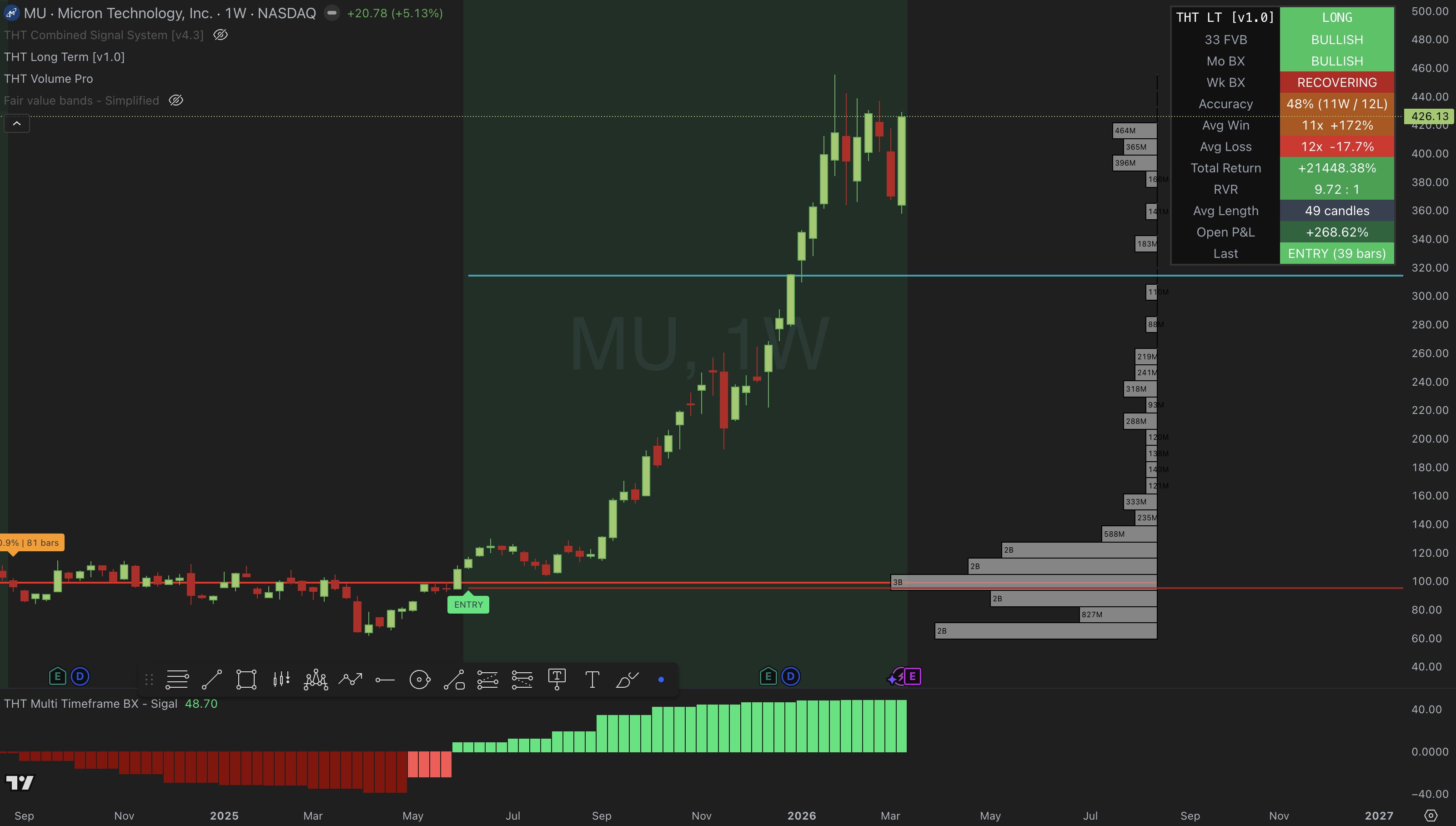 MU bull cycle is still in play and it is up +286% since Monthly BX flipped and our long-term model triggered.