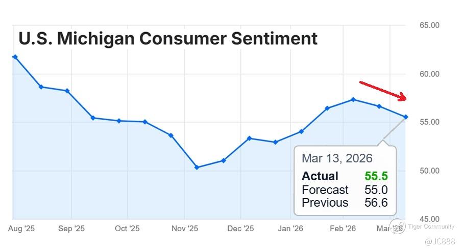 The University of Michigan's Surveys of Consumers said its preliminary Consumer Sentiment Index fell to 55.5 for March 2026, from a final reading of 56.6 in ​February 2026. (see above)