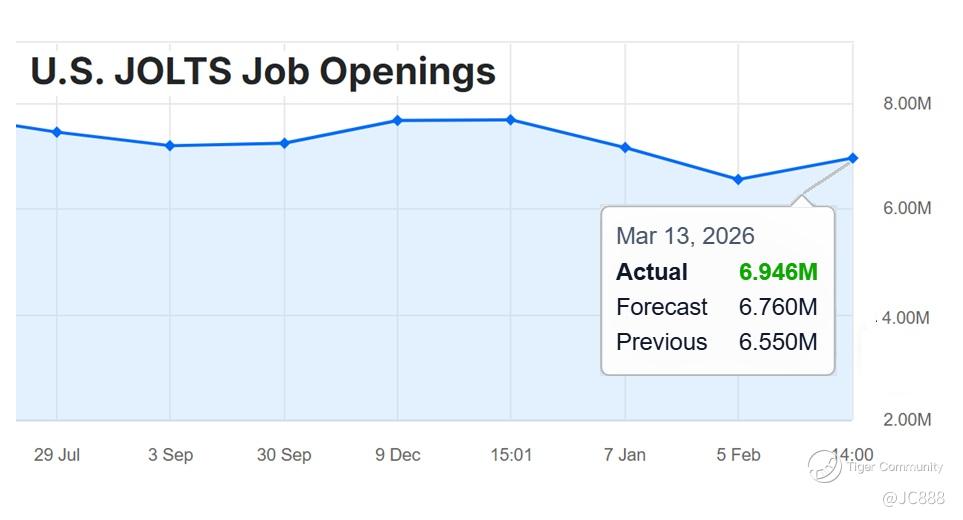 According to US Bureau of Labour Statistics (BLS), job openings, rose by +396,000 to 6.946 million, rebounding from a 5-year low of 6.55 million in December 2025. (see below)