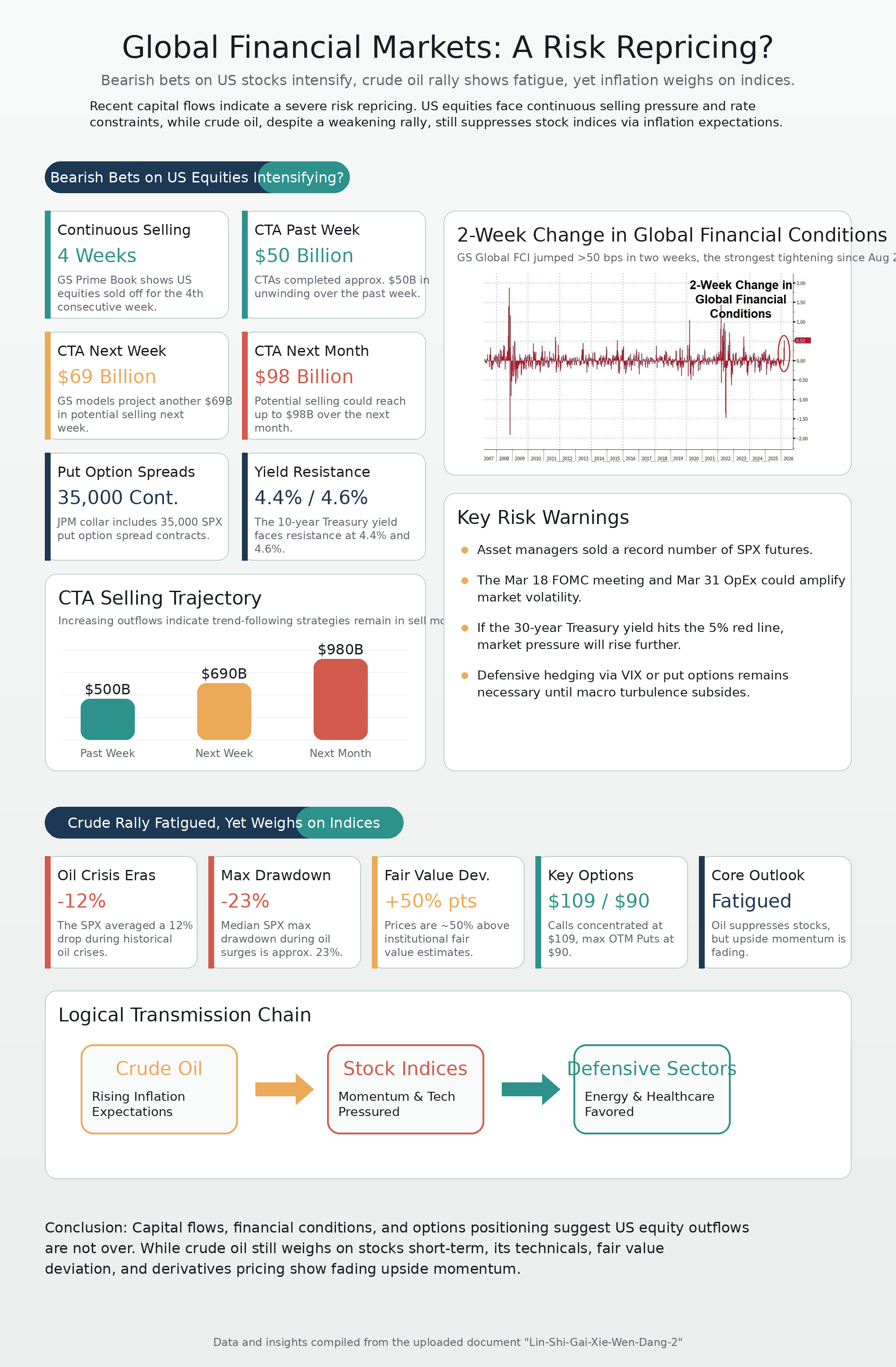 Synthesizing capital flows, the intensity of macroeconomic tightening, and options market bets, the capital exodus from US equities is far from over. The trading volume distribution of equity index futures options indicates that the market's expected downside magnitude remains substantial. Meanwhile, crude oil—acting as the root source of inflation—despite still suppressing US equities in the short term, is exhibiting signs of exhausted upward momentum across its technicals, fair value deviation, and derivatives pricing. Therefore, we conclude that the current crude oil rally is likely to decelerate, while US equity indices may continue to weaken. Investors must remain highly vigilant regarding future market volatility