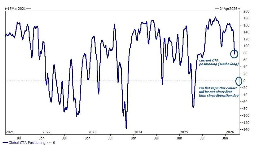 In terms of trend-following strategies, CTA (Commodity Trading Advisor) funds are now definitively in sell mode. Over the past week, CTAs have executed massive position liquidations, cutting roughly $50 billion. According to Goldman Sachs' quantitative models, an estimated $69 billion worth of assets will be sold over the next week, a figure that could soar to $98 billion over the coming month.