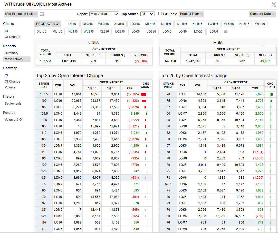 Furthermore, the crude oil volatility index (OVX) has already exhibited an inverted V-shaped reversal. Judging from the volume distribution of WTI crude oil futures options, massive option block trades on March 16 were primarily concentrated in deep out-of-the-money (OTM) options. The major call option blocks were primarily betting on the $109 level (slightly above the $107 resistance); meanwhile, the major put option blocks were densely clustered at $75, $80, and $90, with the largest OTM put order placed at $90. This indicates that the implied selling strategies within the options market assume oil prices are unlikely to substantially break above $109 in the near term, with the anticipated short-term downside floor situated around $90.