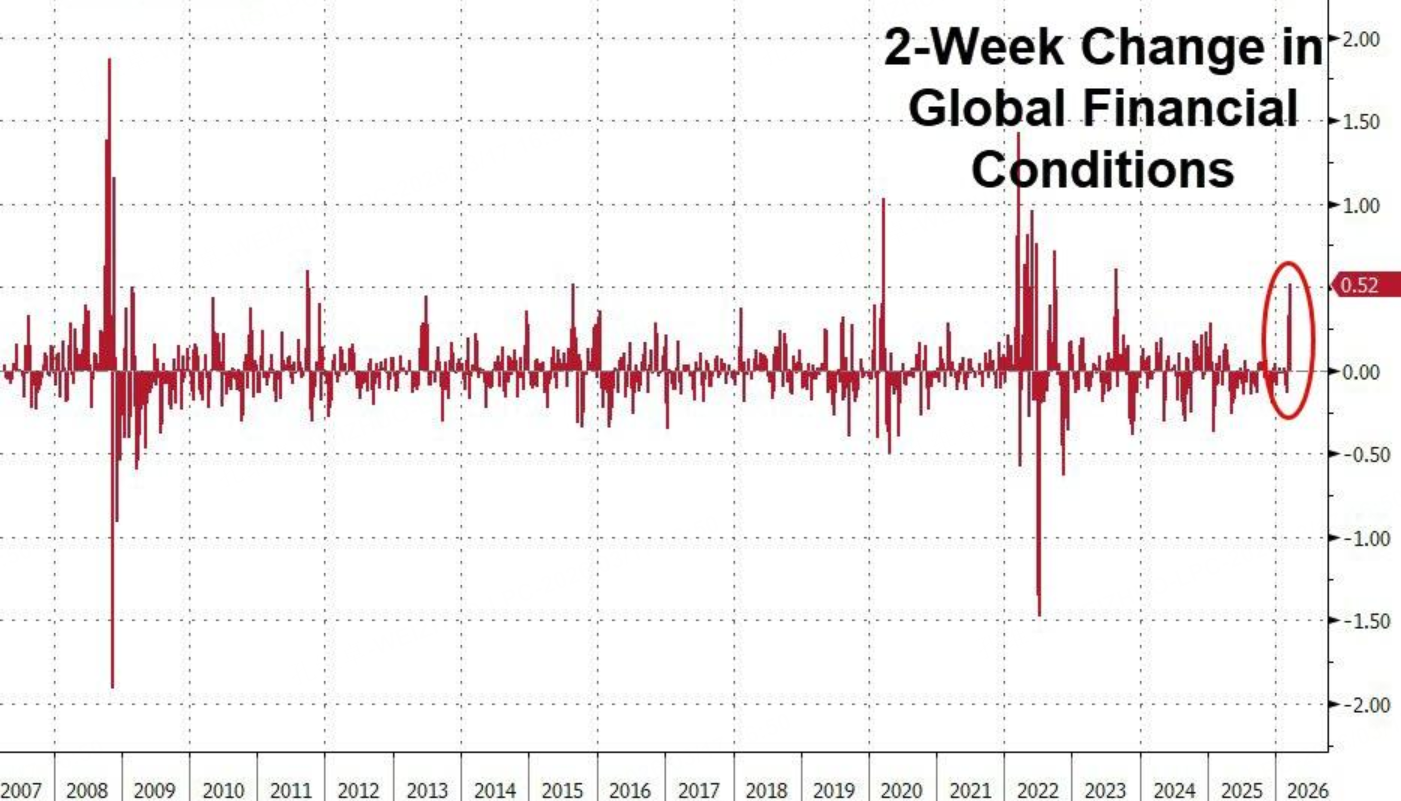 Meanwhile, the global liquidity environment is visibly tightening at a rapid pace. Over the past two weeks, the GS Global FCI (Goldman Sachs Global Financial Conditions Index) has spiked by more than 50 basis points. This marks the most aggressive tightening trend since August 2023, representing a magnitude exceptionally rare outside of crisis periods.