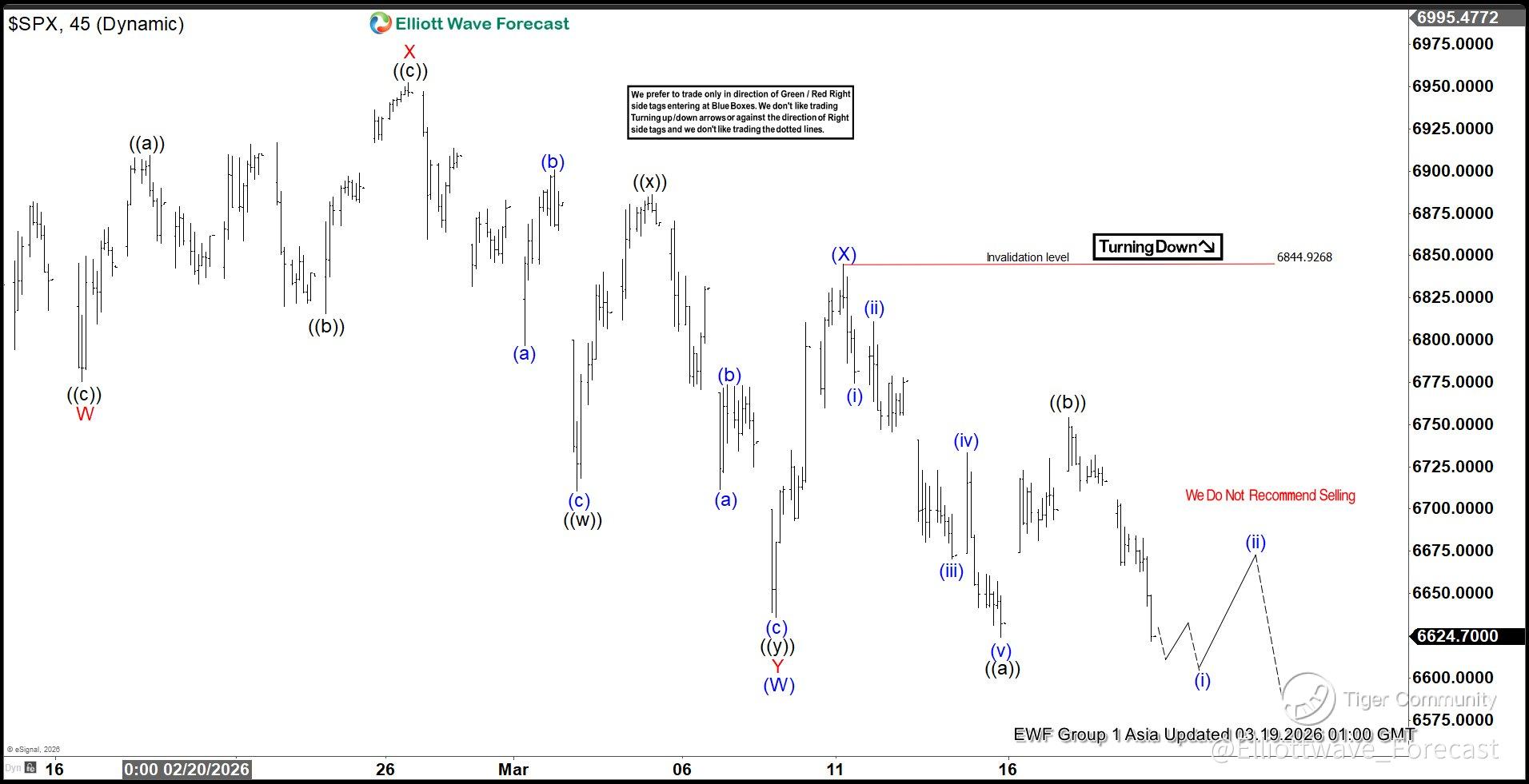 The S&P 500 (SPX) continues to correct the cycle that began from the April 7, 2025 low. The internal subdivision of this correction is unfolding as a double three Elliott Wave structure, which reflects a complex corrective pattern rather than a simple decline. From the January 28, 2026 peak, wave (W) concluded at 6636.04, as illustrated in the 45‑minute chart. Within wave (W), the internal subdivision itself developed as another double three of lesser degree. In this sequence, wave W ended at 6775.5, wave X at 6952.51, and wave Y at 6636.04. This completed wave (W) at the higher degree.