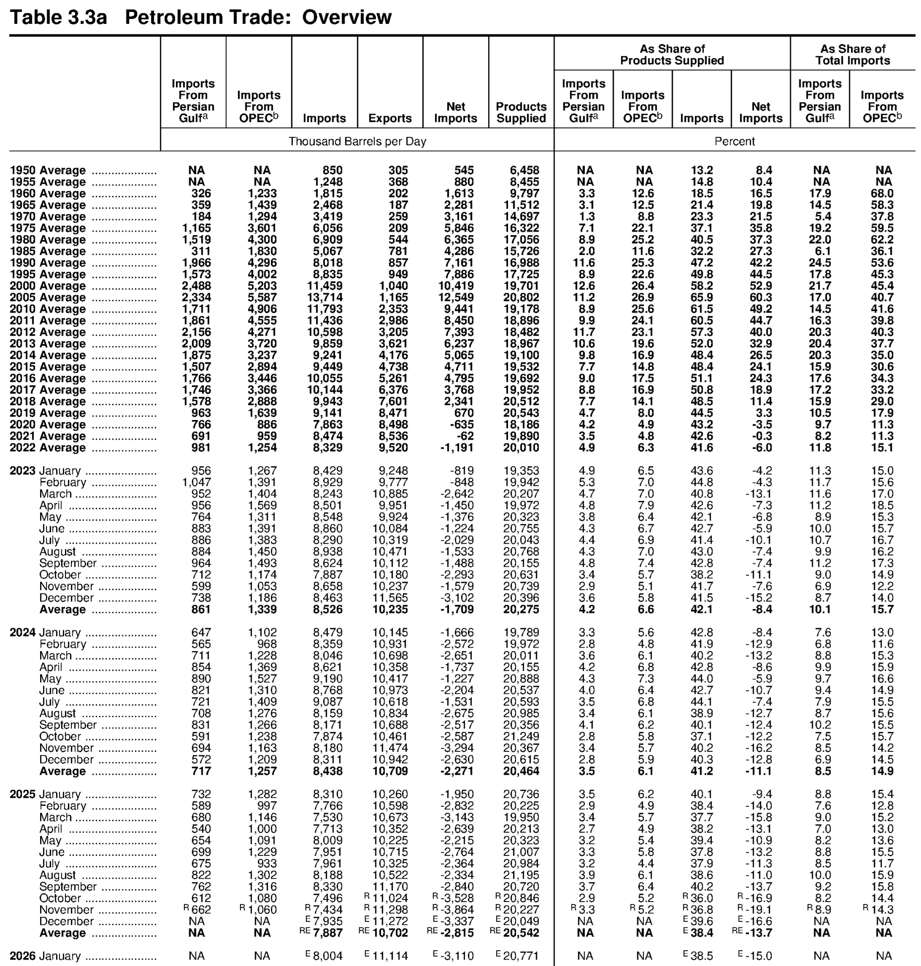 I will also note that imports from the Persian Gulf have gone to almost zero, and OPEC overall is about 5% of U.S. supply.