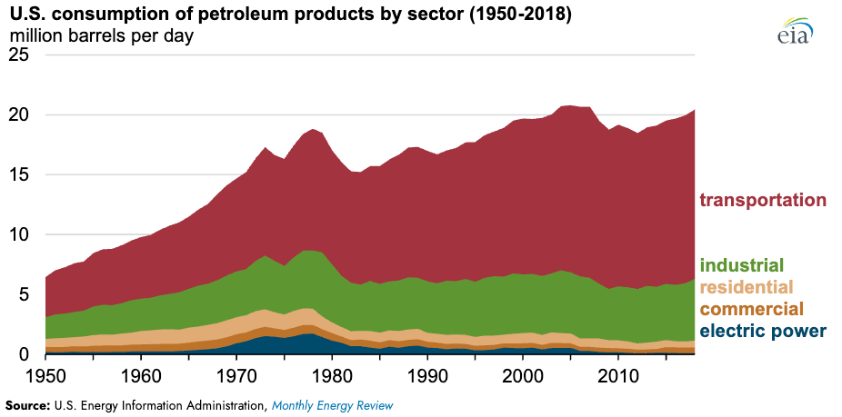Notice that changes in usage followed the Iranian oil shock in 1973 and the oil price spike from 2001 to 2008.