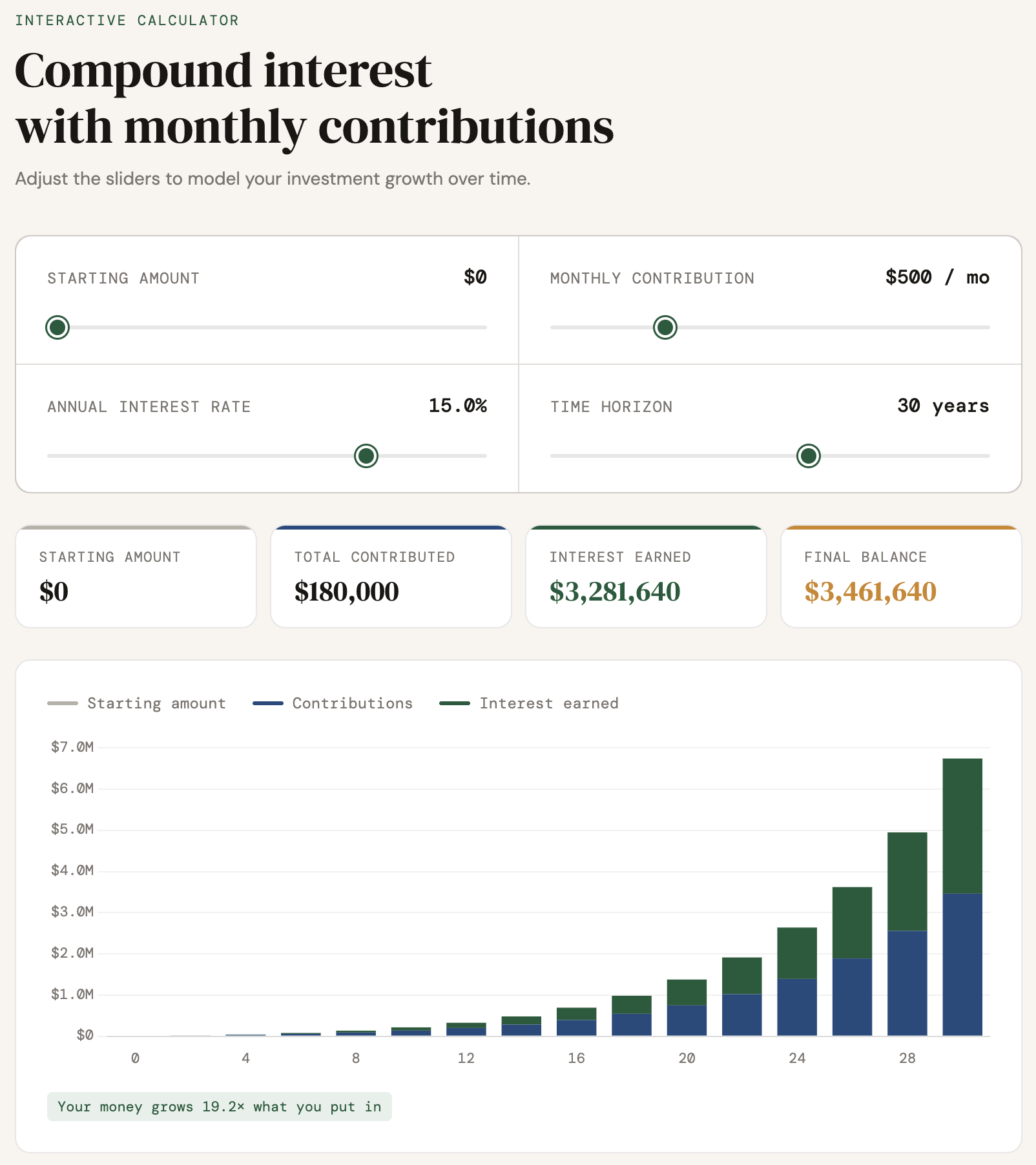 This week, I built a tool to demonstrate how quickly wealth can compound depending on your starting balance, monthly contributions, and time horizon at different growth rates.