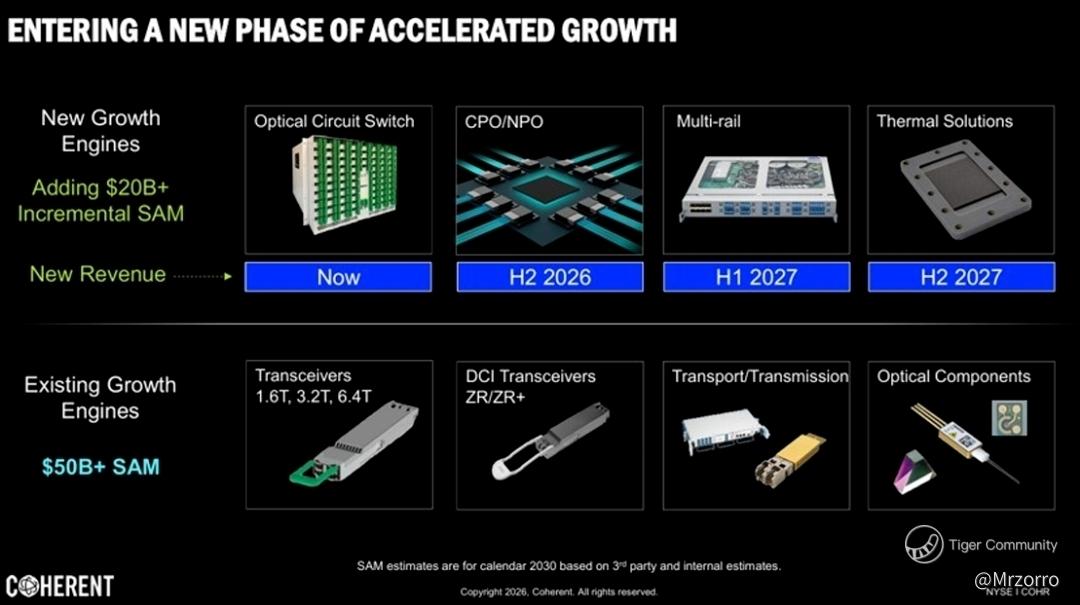 Coherent may offer some of the biggest earnings upside in the group if execution goes right. Morgan Stanley says the company sees a current $50 billion serviceable addressable market, plus another $20 billion-plus of incremental opportunity from OCS, CPO/NPO, multi-rail, and thermal solutions over the next several years. Importantly, the report says those incremental opportunities should all be accretive to gross margins.