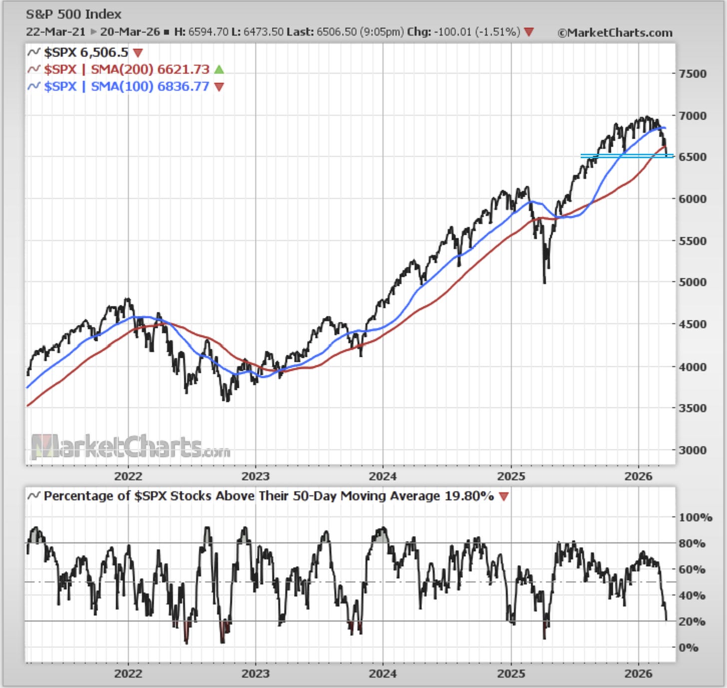 my initial reaction on seeing this week’s technical-check chart is that we went from bad to worse. But on closer inspection it looks like we’re sitting at a major support level with 50dma breadth now into proper oversold conditions. Add to that Trump-talk around “winding down” military efforts, and a decent (albeit incomplete) reset in sentiment, and it looks like a key juncture.