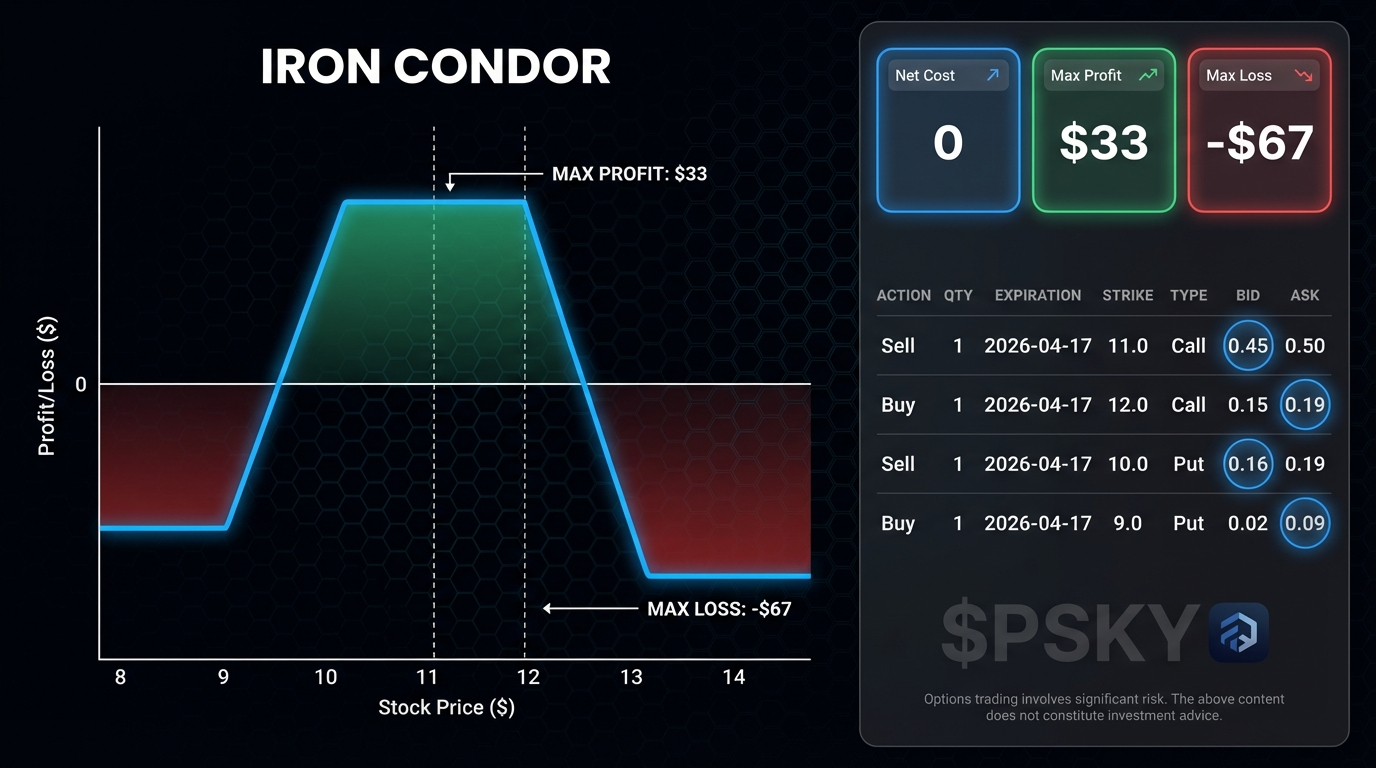 Thesis: Neutral to range-bound view on PSKY into April expiration. Expecting the stock to consolidate within the $9-$12 range through expiration. Selling premium on both sides while defining tight risk—ideal for a low-volatility environment where the underlying chops sideways. Max pain is a breakout above $12 or breakdown below $9.