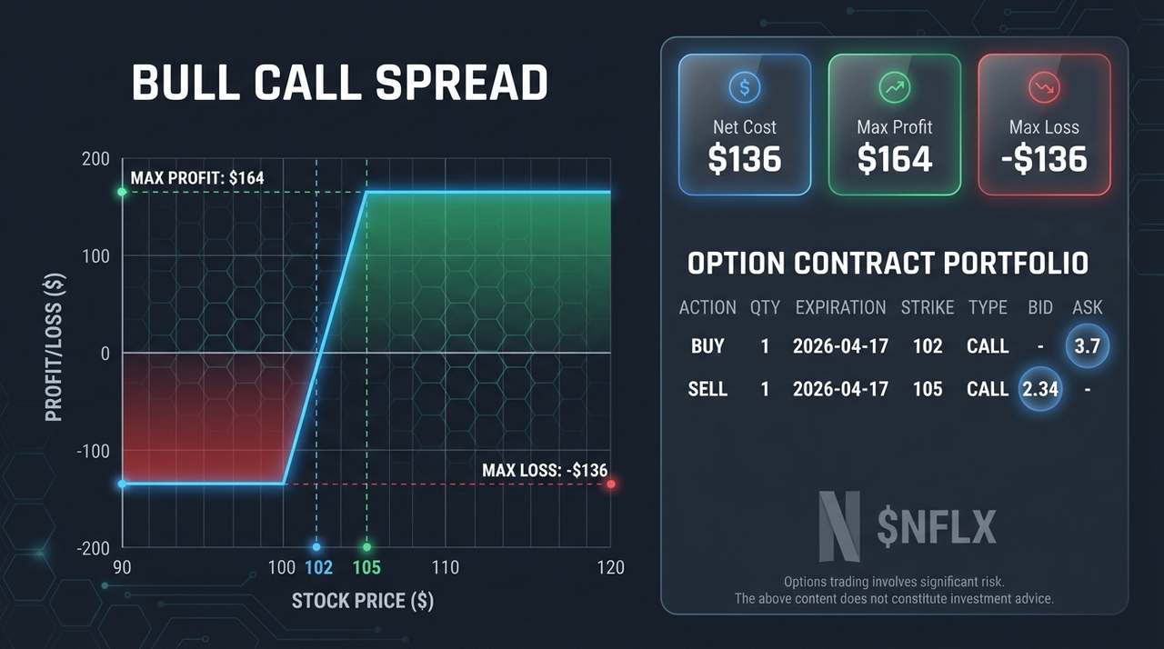 $NFLX Bull Call Spread: $136 Cost, Max Profit $164 (Apr 17, 102/105)