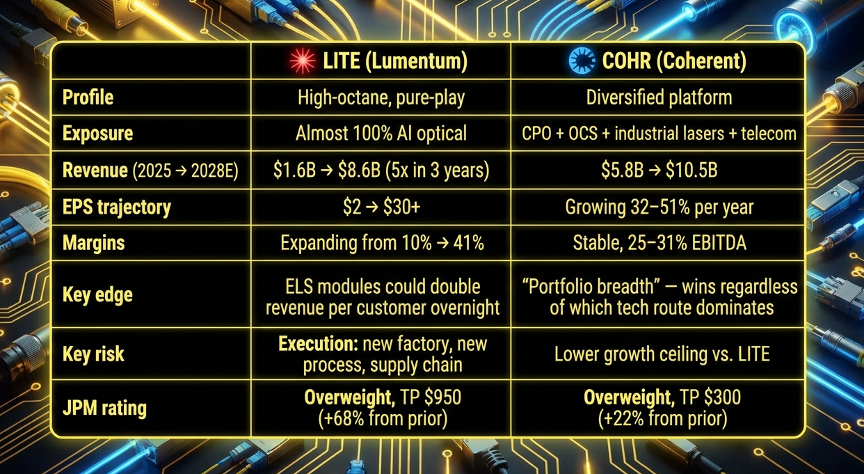 J.P. Morgan's summary in one line: LITE is the higher upside, higher risk bet. COHR is the "buy the whole sector without picking the winning horse" play.