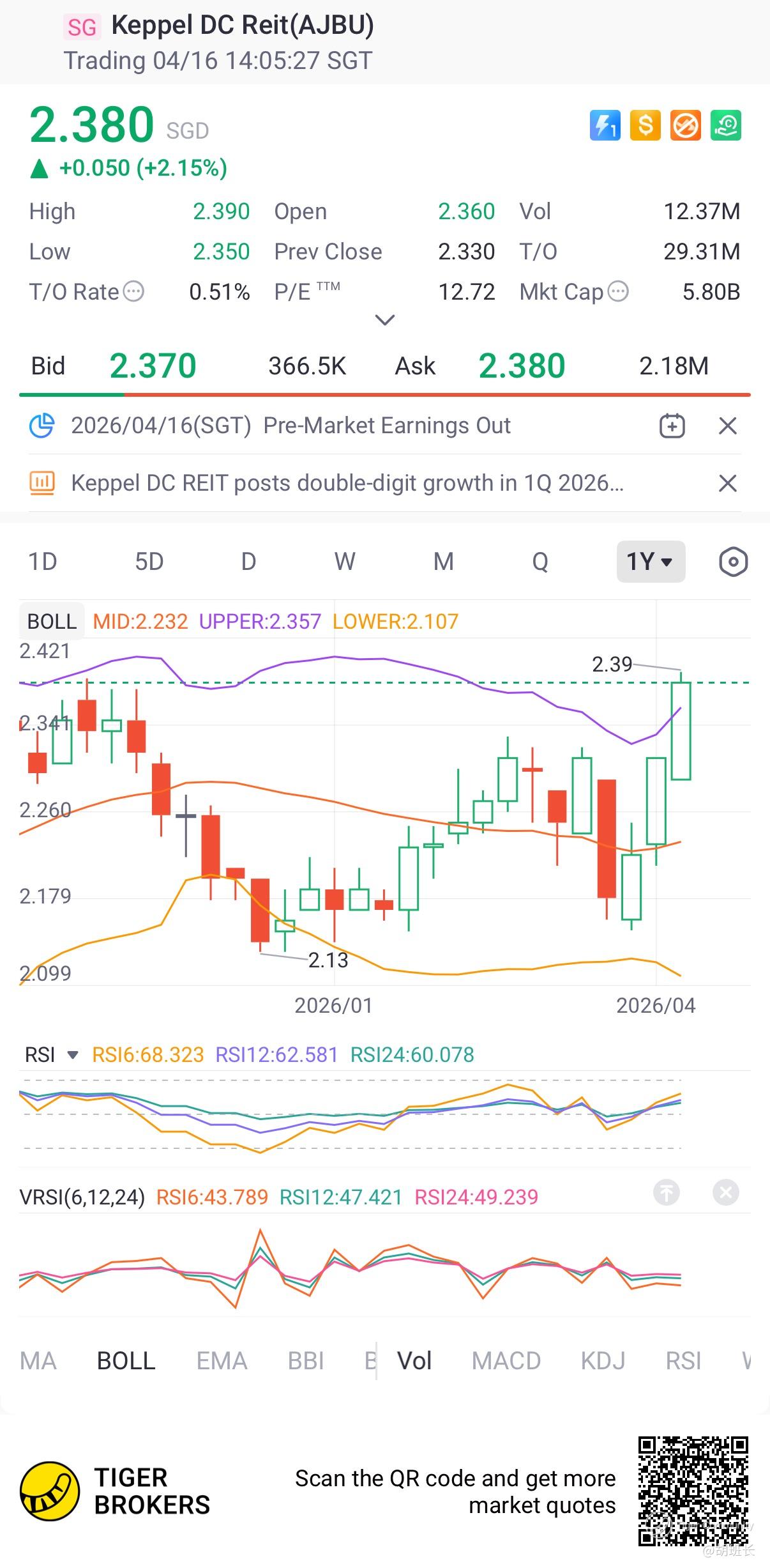 $Keppel DC Reit(AJBU.SI)$ near 52W high, above Upper Bollinger