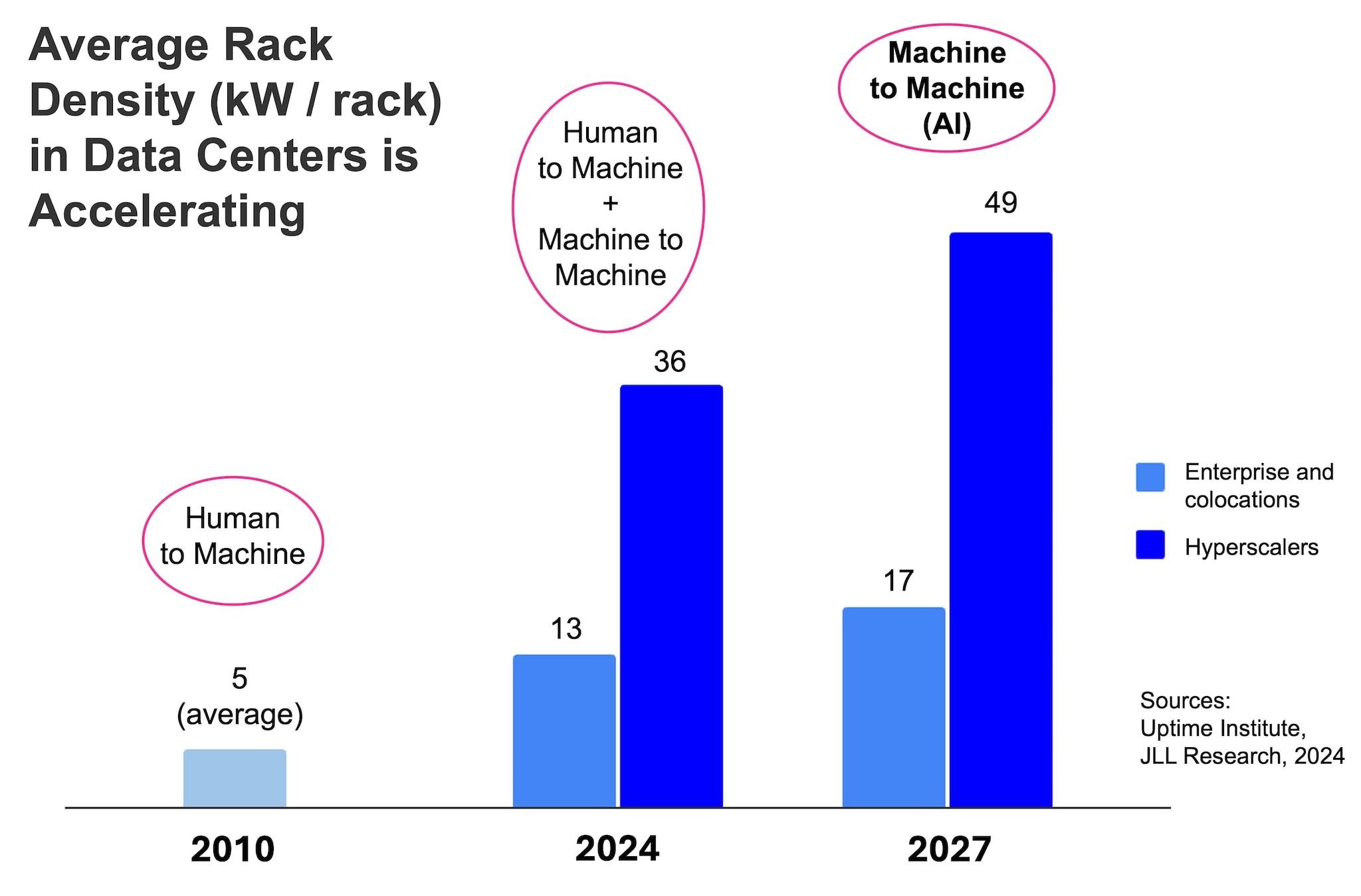 The only relevant metric is rack power density. Next-generation clusters are operating at 100–120 kW per rack, rendering legacy data centers designed around 10 kW structurally obsolete.